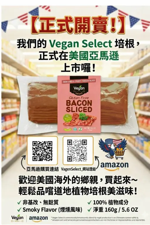 親愛的美國鄉親、海外朋友們,這是我們用心打造的植物性美味,口感酥脆、香氣逼真,讓您在健康與美味之間不用妥協。早餐、三明治、沙拉、料理搭配都超合拍!