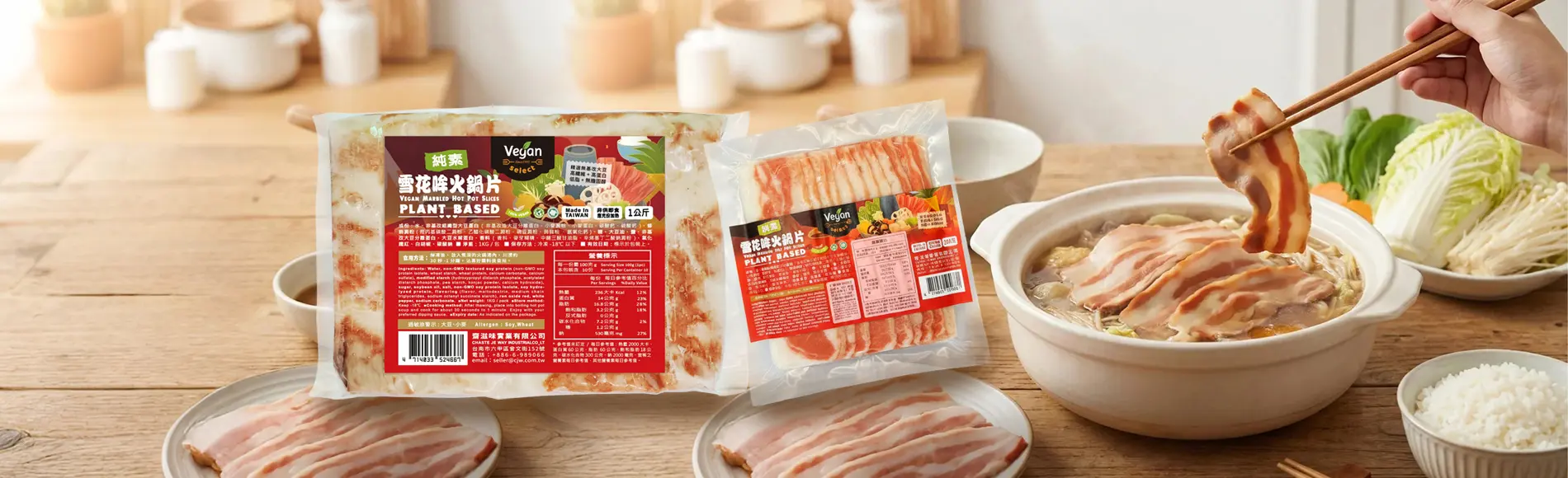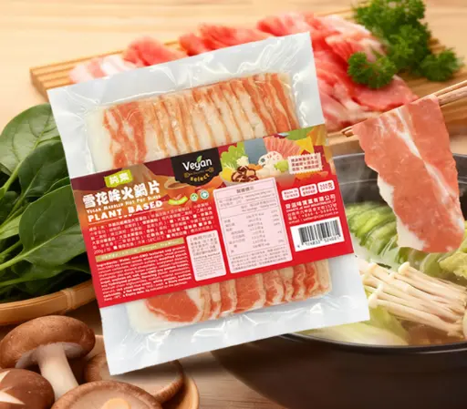 我們的純素雪花哞火鍋片呈現出鮮紅誘人的色澤,專為追求濃郁視覺與豐富口感的食客設計,這款肉片強調更為鮮明的肉香與扎實感,著色技術源自天然氧化鐵成分,讓肉片在鍋中翻滾時,呈現出令人食指大動的色澤,且含有鐵質。吸收湯汁後每一口都融合各湯頭美味,這是一款喜愛鮮美紅肉質感的朋友們最理想的純素選擇,讓您的蔬食火鍋也能擁有極致的感官享受。