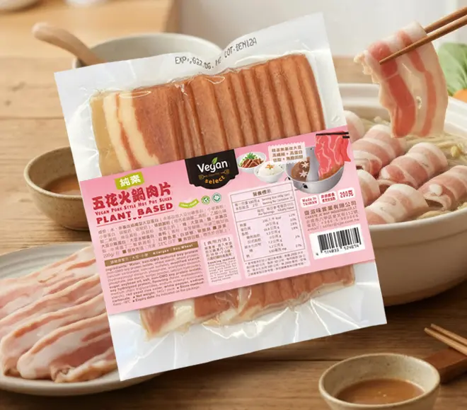 我們精心研發的純素五花火鍋肉片,獨特的植物蛋白工藝,著色技術源自天然紅麴成分,打造出軟嫩中帶有彈性的絕佳口感,讓您在涮煮過程中,能完美吸附湯底精華。